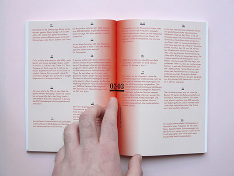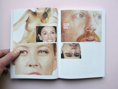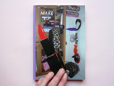 Dans la cosmétologie d’Eugène Rimmel, le rouge, couleur du fard, est une couleur éclatante, ostentatoire. Une couleur sexuelle liée aux attributs de la crête, du mamelon, des lèvres… de l’afflux sanguin lié à une excitation, une émotion. Dans leur projet de diplôme Make-up, Tobias Becker & Matthias Kantereit font du pli de couture de la double-page comme une colonne vertébrale sensible de l’ouvrage, voire une métaphore érotique, l’origine du monde éditorial…