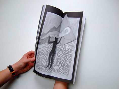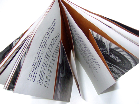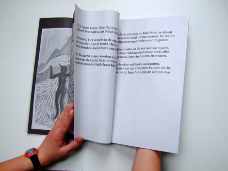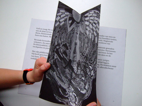 On peut aussi s’intéresser à la partie libre de la page, ce grand fond, cette limite infra-mince qui s’oppose à la colonne vertébrale de la reliure et que l’on agit pour passer d’une page à l’autre. Cet entre de la feuille, en y insérant, à la marge, comme l’a fait Boris van den Eyden en 2010, des images (celles d’Amanda Koelman) qui se révéleront dans la dynamique de l’activation de la séquence de l’imprimé (illustrations 1 à 4).