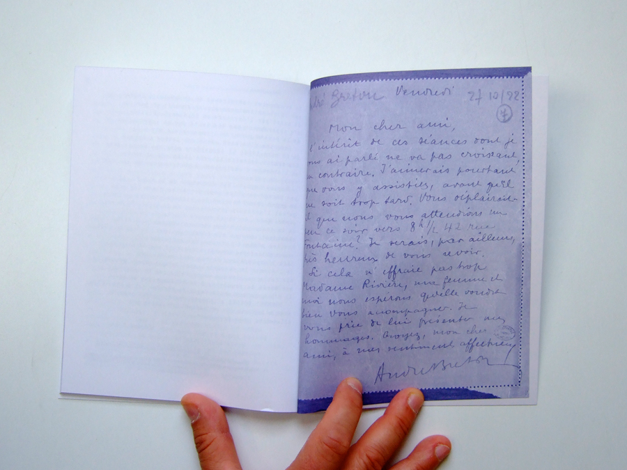 La postface de Jérôme Duwa tente de replacer le texte surréaliste de Rivière dans sa contemporanéité. La prégnance des formes dactylographiés ramène à une pensée de la machine, à un moment de la rationalité typographique. Flottantes en bas de pages, les notes nous ramènent au texte de Jacques Rivière, au désir d’une vie toujours mouvante, à l’intuition d’une composition. Mais aussi au flux de l’écriture manuscrite, comme celle qui est donnée à voir dans le pneumatique en fin d’ouvrage.