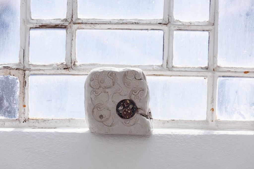 Ă€ l’étage, la quasi-totalitĂ© de l’exposition a Ă©lu domicile au bord des fenĂŞtres de l’espace. LibĂ©rĂ©es pour l’occasion de tout ce qui les occultait, elles diffusent une abondante lumière naturelle auprès de laquelle les Ĺ“uvres se tiennent dans un lĂ©ger contre-jour. Ce geste de restauration – retrouver la lumière d’origine du lieu, celle des temps du culte – donne Ă  voir avant tout le lieu, sans artifice et, Ă  travers les fenĂŞtres, le paysage qui entoure la Synagogue, dans toute sa simplicitĂ©. Ce sont ces fenĂŞtres, avec leur multitude de lobes cerclĂ©s de mĂ©tal, qui font rĂ©ellement les mille yeux de cette exposition. Tout contre leurs panneaux aux Ă©lĂ©gants dessins, de nouveaux plateaux sont placĂ©s Ă  la verticale, accompagnĂ©s de petites sculptures en terre crue oĂą s’imprime la forme d’un objet rond et de mĂ©canismes de montre, qu’on retrouve pris dans la terre de l’une d’entre elles. Il s’agirait, lĂ  aussi, d’une lunette ; un objet de vision, que l’artiste nous fait suivre Ă  la trace, comme on suit des traces de pas. Cette confusion entre ce qui voit et ce qui est vu, l’œil et ce qui l’entoure fait partie des aspects les plus mystĂ©rieux du travail de ClĂ©ment Rodzielski, et rappelle cette croyance ancienne (rapportĂ©e par Huysmans dans Ă€ Rebours) selon laquelle les yeux des animaux conservent après leur mort, Ă  l’intĂ©rieur de leur rĂ©tine, l’image du monde tel qu’il se prĂ©sentait Ă  leur dernier regard.