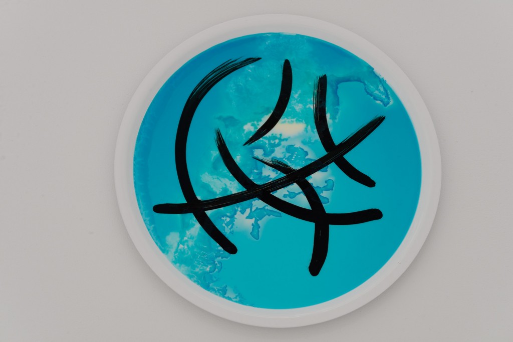 Dès l’abord, le lieu est effacĂ© par un grand mur blanc construit en travers du passage, dans un endroit oĂą il contrarie le regard du visiteur qui souhaite lever les yeux vers le plafond en coupole de la Synagogue. Pourtant, cet objet, vu depuis les galeries supĂ©rieures, s’avère ĂŞtre en rĂ©alitĂ© un espace d’exposition supplĂ©mentaire gagnĂ© sur l’architecture du lieu : ClĂ©ment Rodzielski y a dĂ©posĂ© une sĂ©rie de petites peintures rondes sur plateau – un genre en soi – perchĂ©es sur ce socle dĂ©mesurĂ©. Ă€ leur surface s’entrecroisent des motifs abstraits Ă  l’encre noire, dont le dessin est dĂ©rivĂ© des lignes de la main (de la mĂŞme manière que, dans l’écriture japonaise, les syllabaires dĂ©rivent de caractères chinois, dont la forme a Ă©tĂ© assouplie par un geste calligraphique plus rapide).