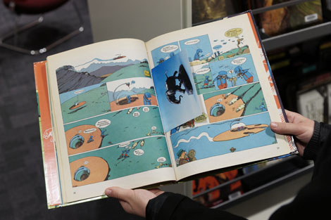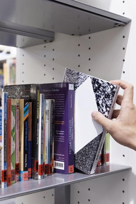 « L’exposition à la médiathèque étant quasiment invisible puisque les livres et leur nouvelle jaquette étaient remis dans les rayons » en pâture à la découverte des lecteurs…
