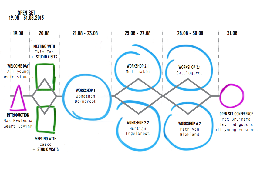 Je suis membre de l’Ă©quipe de la Dutch graphic design summer school OPEN SET. La session de cette annĂ©e se passe Ă Breda, en Hollande, du 19 au 31 AoĂ»t 2013. Notre Ă©vĂ©nement s’adresse aux jeunes designers, crĂ©ateurs et penseurs passionnĂ©s par le graphisme. Le but est de se concentrer sur la valeur sociale du design en crĂ©ant un espace de dĂ©bat, d’échange de savoirs et d’expĂ©riences, questionnant les formes de communication visuelle. Afin de satisfaire ce but, nous avons invitĂ© plusieurs tuteurs pratiquant diverses approches de la discipline graphique, tels que Jonathan Barnbrook, Petr van Blokland, Catalogtree, Jan van Toorn, Willem Velthoven, Martijn Engelbregt, Max Bruinsma (Ă©diteur en chef Ă ITEMS magazine) et Geert Lovink (directeur de l’Institut des RĂ©seaux Culturels Ă Amsterdam). Cet Ă©vĂ©nement est une initiative Ă©tudiante indĂ©pendante, avec le support du festival de graphisme de Breda et l’acadĂ©mie des art St-Joost.