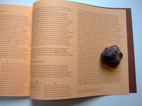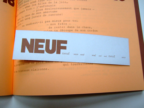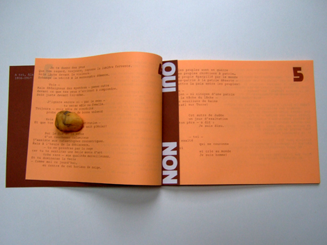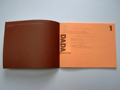 4 Le format de la collection? Retourné. Le pantone choisi? Un vrai caca de bébé, qui mange de bons légumes. Un mystérieux papier trouvé? Des chutes du Bar Nicanor, lui-même imprimé en caractères sépia sur papier orangé. Pourquoi? Dada.
