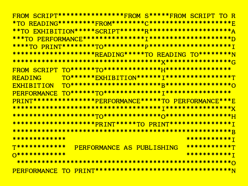 Performance as Publishing est un projet de recherche indépendant initié par Nicole Bachmann et Ruth Beale. Explorant les liens possibles entre le mot écrit (archive, textes trouvés, fiction, etc.) et l’exposition, P as P est une plateforme expérimentale où textes et mise en scène s’interrogent, se confondent, fabriquent de nouveaux espaces où le mot est à la fois visible et lisible mais aussi sonore, envahissant les lieux comme d’autres chambres d’écho.