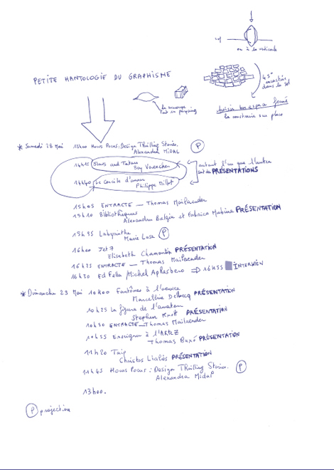 Votre serviteur, Catherine Guiral et Brice Domingues coordonnent pour la seconde annĂ©e le colloque du week end inaugural du Festival international de l’affiche et du graphisme de Chaumont : les 28 et 29 mai 2011. Après la notion d’archive en 2010, ils proposent cette annĂ©e une «petite hantologie du graphisme». Un tour d’horizon modeste, forcĂ©ment partial et partiel de ce qui peut hanter une discipline complexe qui se construit au croisement ambigu de plusieurs aspirations plus ou moins (in)formulĂ©es, (im)pensĂ©es. Une petite anthologie des antres et des entres du graphisme, de ses marges et de ses marches, de ses hors-champs plus ou moins dans le champ, de ce qui le traverse…