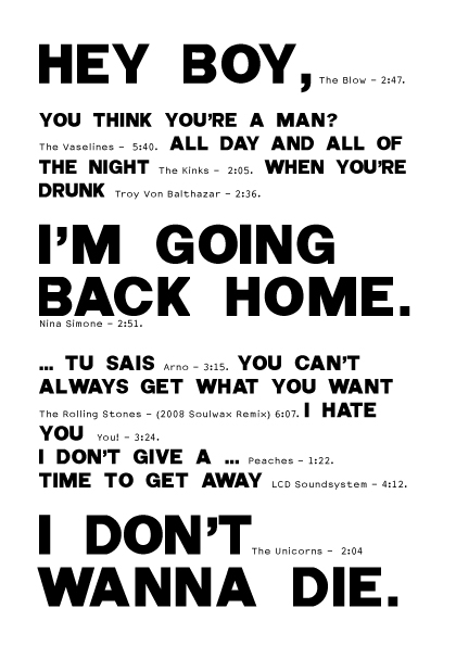Le projet contributif Playlist story, mené par des étudiants des Beaux arts de Lyon, aboutira à une exposition qui se tiendra à l’occasion du festival des Nuits sonores, en mai 2010. L’idée est de réaliser des genre de cadavres exquis plus ou moins sensés à partir de la matière des titres ou des paroles de musique, comme une sorte de poétique de la playlist.