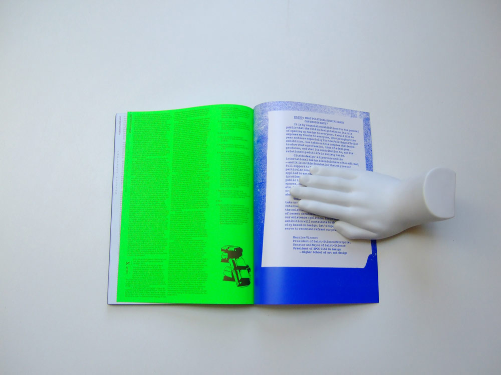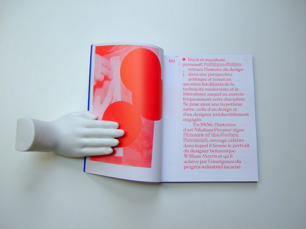 Avec Politique Fiction, Alexandra Midal présente depuis peu une nouvelle fresque théorique piquante, télescopant extraits de films et documents d’archive, pour dégager, dans l’esthétique du choc et la digression, un discours sur les implications morales et politiques d’un design résolument situé du côté des consistances de l’art et de la « catalyse des imaginaires ». Une démonstration qui vient s’élargir à tout l’espace de démonstration d’une exposition à la Cité du design de Saint Étienne. Une exposition et un exposé relayés par un catalogue réalisé par les bons soins d’officeabc qui se heurte à la question épineuse des droits d’auteur. Un cadre légal qui interdit à nombre d’astronomes iconographes de relayer publiquement leurs propositions. Une contrainte à laquelle nos habitués de la pirouette savante répondent en tentant, avec le concours éclairé de Sarah Kremer, de paradoxales ekphrasis réticentes par l’image et tout un jeu sur le détail en typographie assez éloigné des modesties empiriques d’un Jost Hochuli ou d’un Jan Tschichold.