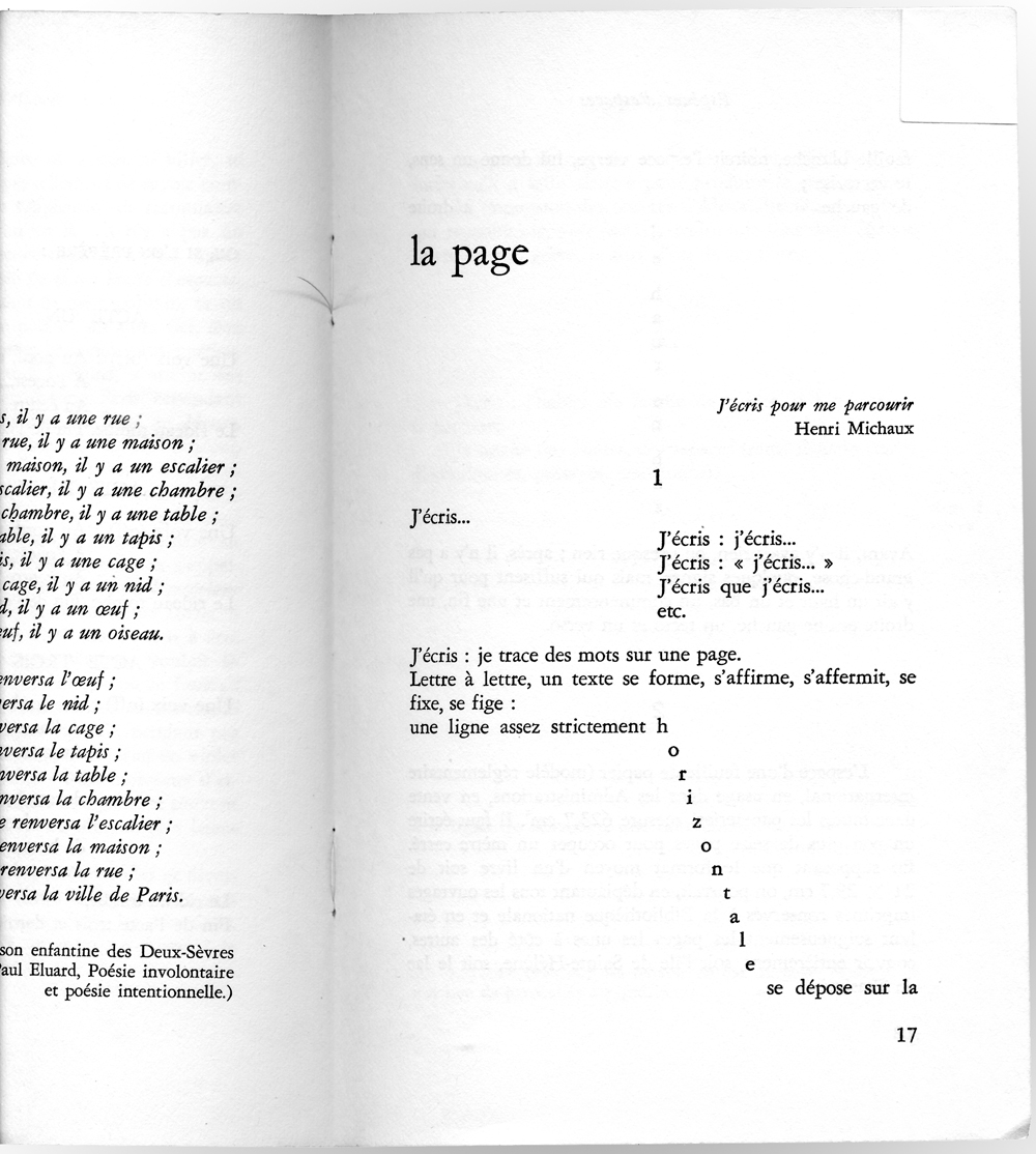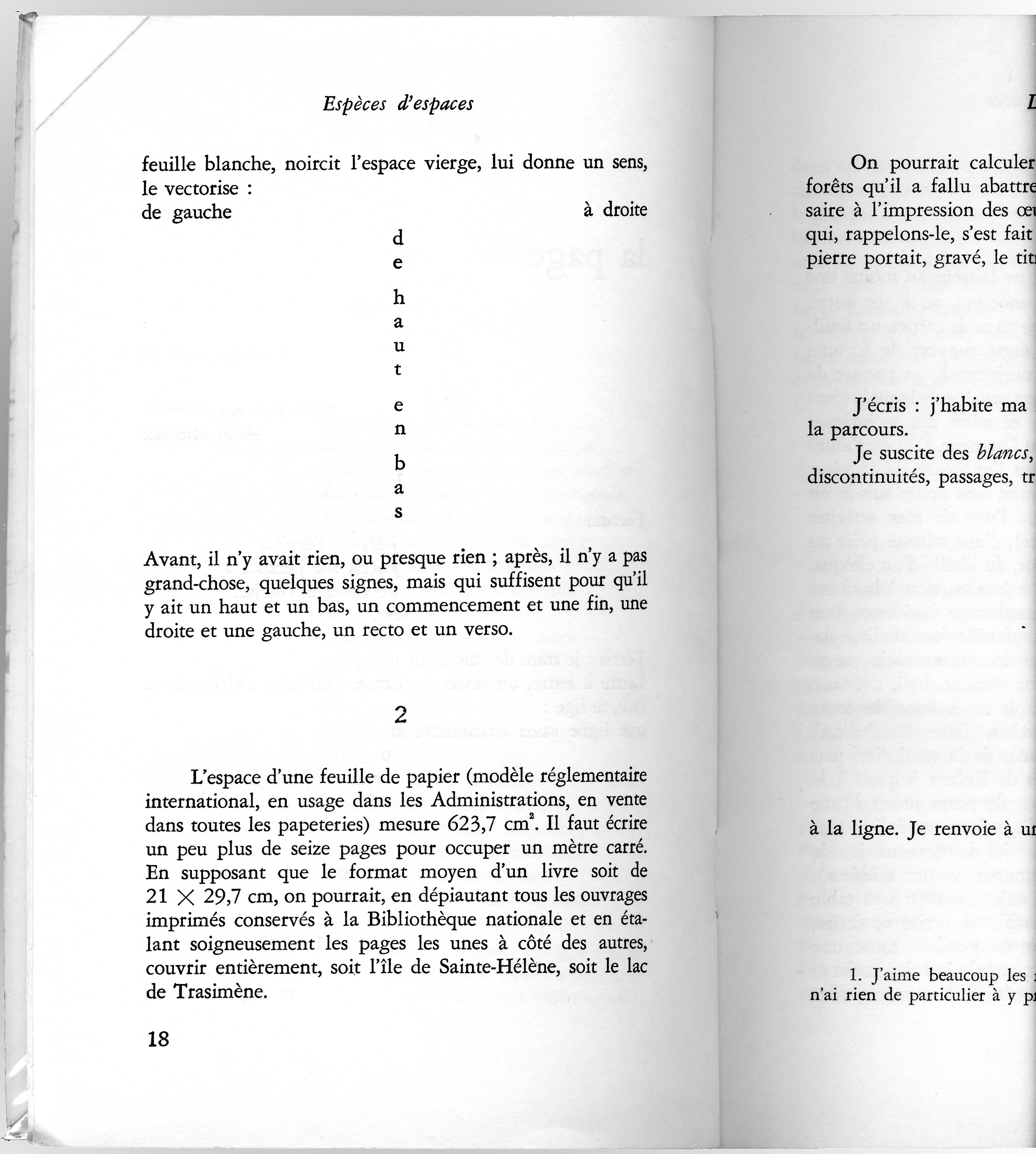 • cité par Sylvie Lefèvre p. 61-64 de son livre La Magie du codex, publié aux Belles Lettres en 2023 : dans Espèces d’espaces (p. 17-18 du livre publié par les éditions Galilée, en 1974) Perec écrit, entre autres, l’espace de la page en y inscrivant ses mots, composés de haut en bas, selon un jeu de composition calligrammatique plus ou moins auto-référentiel :