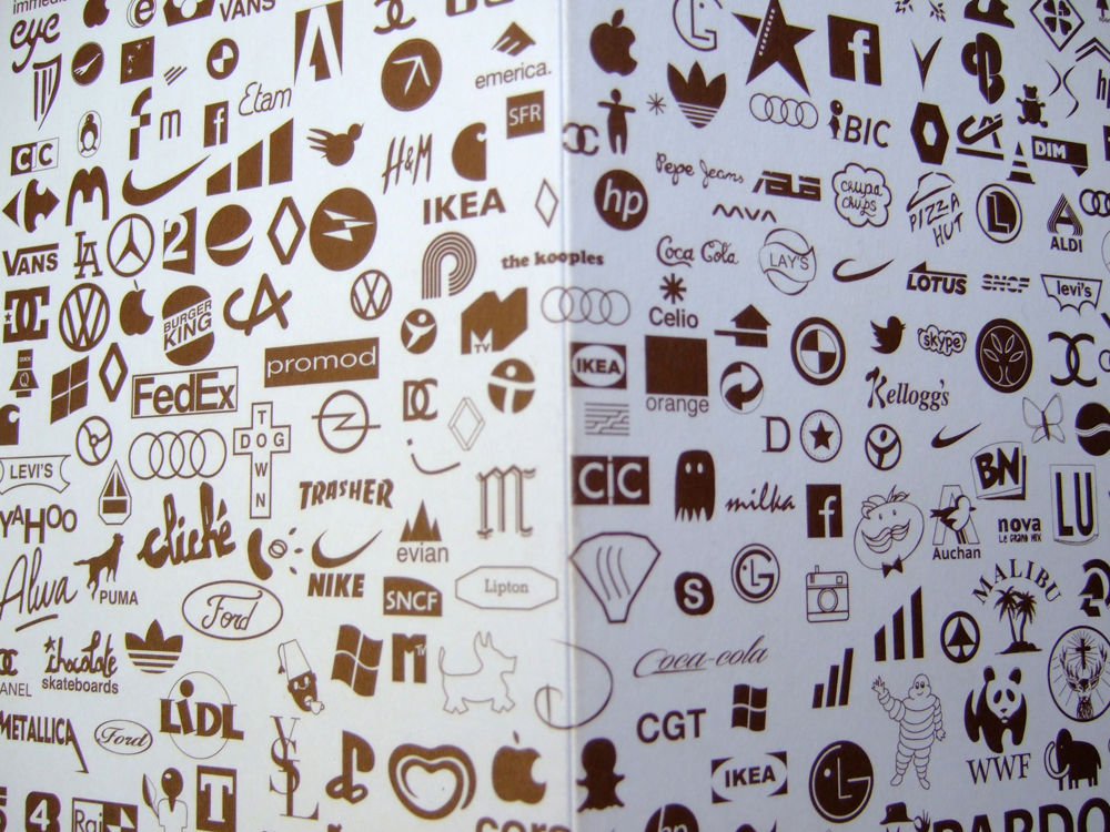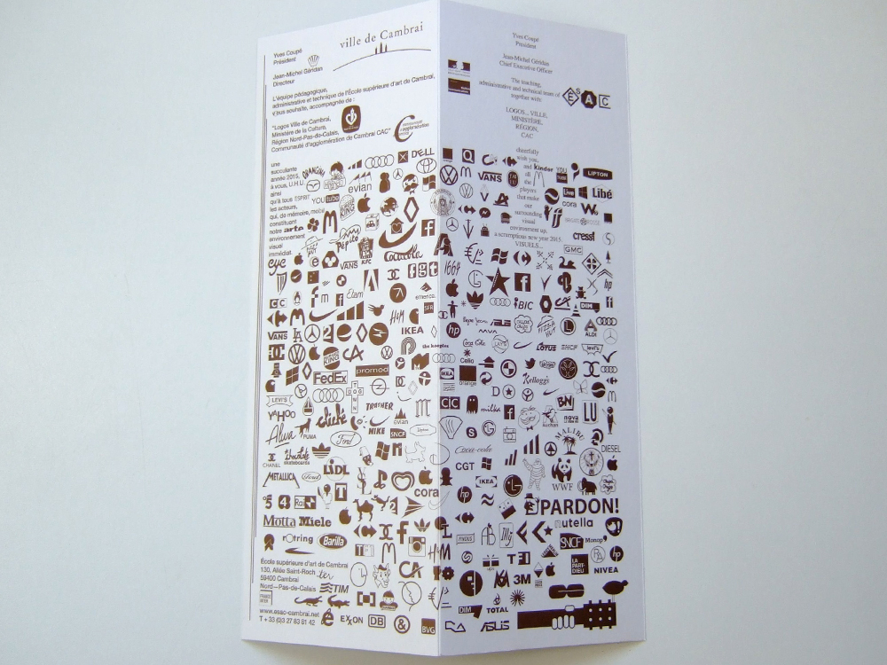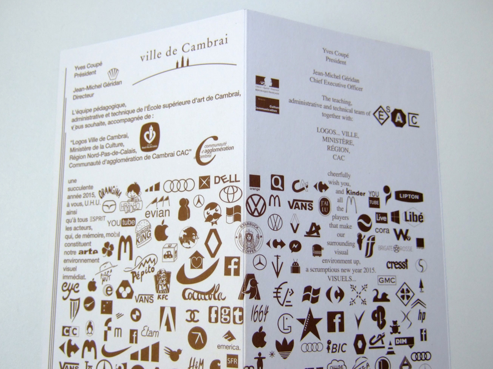 Au verso, sur papier mat, la structure attendue des bons vœux de nouvelle année, en français et anglais, augmentés d’une galaxie de logotypes réalisés de mémoire par les étudiants de Mathias Schweizer à la prometteuse Ésac Cambrai.