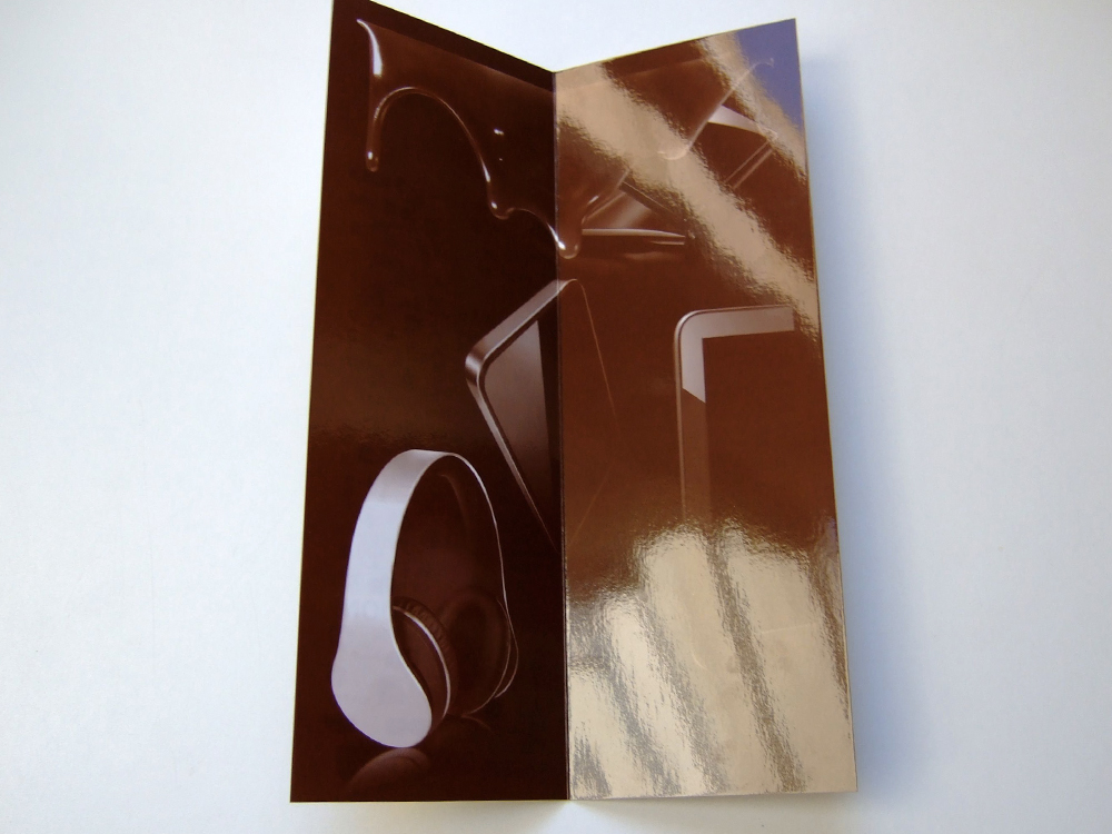 Au recto, l’autel miniature retors des stéréotypes visuels de notre culture marchande de communication et d’attachement sur papier hyper glacé et monochromie peut-être chocolat.