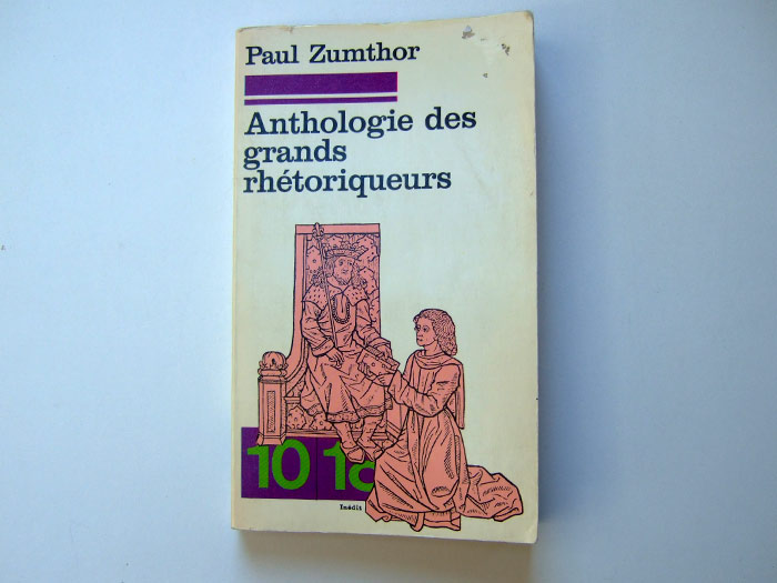 • 1_ Paul Zumthor, Anthologie des grands rhĂ©toriqueurs, 10 18, 1978, couverture de Pierre Bernard, homonyme du fameux grapusien qui me trompa ainsi que Philippe Millot et, paraĂ®t-il Karel Martens…