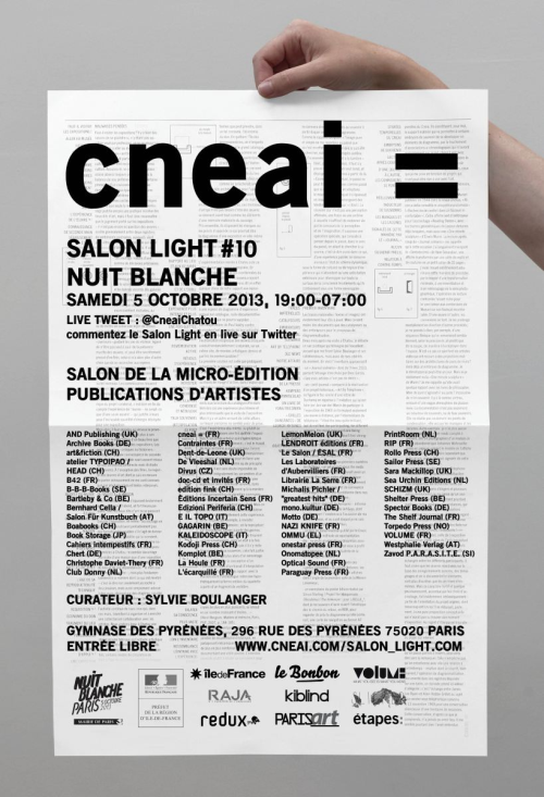 Pour célébrer sa 10e édition, le Salon Light organisé par le Cneai depuis 2004, s’inscrit au cœur du parcours de Nuit Blanche et invite cinquante éditeurs internationaux et indépendants à présenter leurs nouvelles publications d’artistes. Plateforme de diffusion de l’actualité des pratiques éditoriales, le Salon Light invente une aire de jeux nocturnes, où l’on se joue des distinctions entre œuvre d’art, multiples et éditions. Toute la nuit, les événements du Salon Light sont commentés et diffusés en direct par les éditeurs et des invités, journalistes, auteurs, artistes… via un Live Tweet ouvert à tous les internautes de la Nuit Blanche.