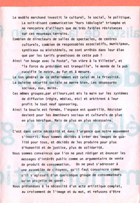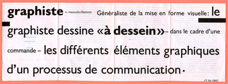 « L’expression “graphisme d’utilitĂ© publique” est nĂ©e d’un effort collectif d’Ă©criture vers 1986/87. Il y a eu diffĂ©rentes variables et diffĂ©rents usages. Dans le document joint (1), il s’agit d’ailleurs du “graphisme d’utilitĂ© sociale”.
