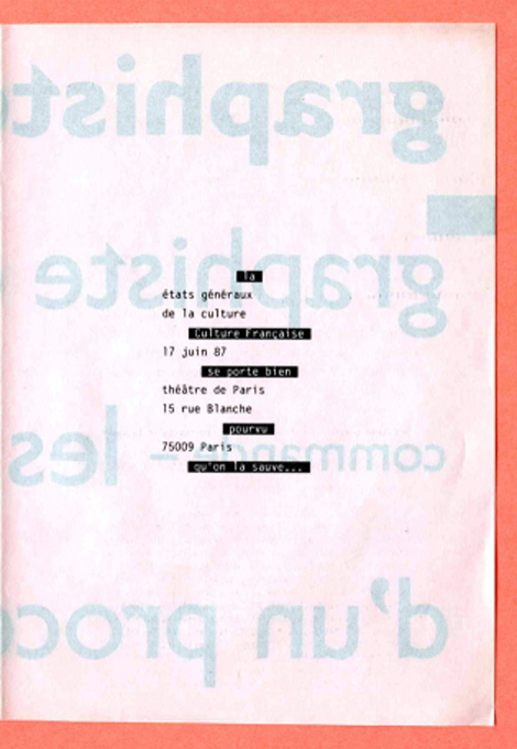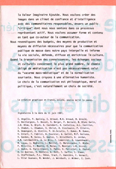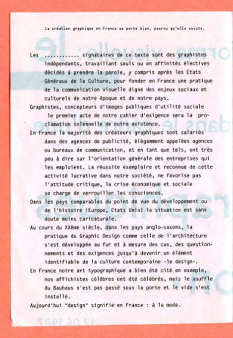 Le texte joint (1) visait donc les graphistes indĂ©pendants, repĂ©rĂ©s ou en voie de l’être afin qu’ils rejoignent les “États gĂ©nĂ©raux de la Culture” Ă l’instar des professions artistiques qui s’y rencontraient Ă l’époque sous l’autoritĂ© dynamique et gĂ©nĂ©reuse de Jack Ralite.