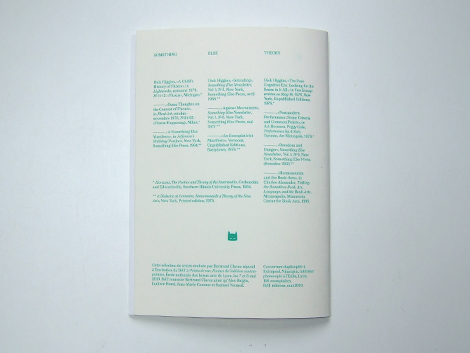 Dernier événement en date, à l’occasion du très bel événement Points de vue. Formes de l’édition contemporaine, BAT proposait Something else theory. L’idée de cette modeste et radicale édition duplicopiée et photocopiée, qui pourrait annoncer une nouvelle collection à flux tendu des éditions BAT, est de regrouper sans apprêt une sélection de morceaux choisis de la bibliothèque exemplaire du spécialiste reconnu d’un mouvement artistique marquant des XIXe et XXe siècles. En l’occurrence Bertrand Clavez et le mouvement Fluxus.