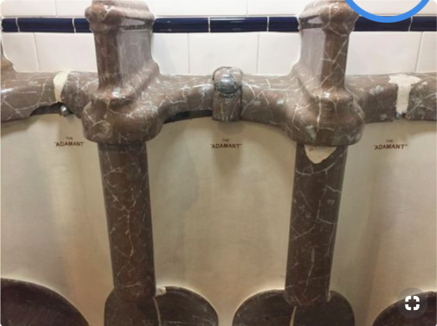 After a couple of hours spent in the beer soaked wooden hut of the bar area and in the middle of a particularly creamy third pint, the proverbial penny had to be spent. Wandering through the Thursday night crowd towards the men’s toilets, I held my breath as I turned a corner into the cramped space and was taken aback by the sight of a brand new, pink, pinstriped shirt and a brown leather belt hanging from a tap at the top of a particularly ornate central ceramic and marble arched urinal. No cabinets, just one wall lined with the barest steel trough, another with three stainless steel sinks, and at the end of the room, on the back wall, sitting between the two, that fantastic series of marble arches, almost one meter sixty in height, with their elegant embedded chrome pipework crowning the ensemble.