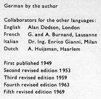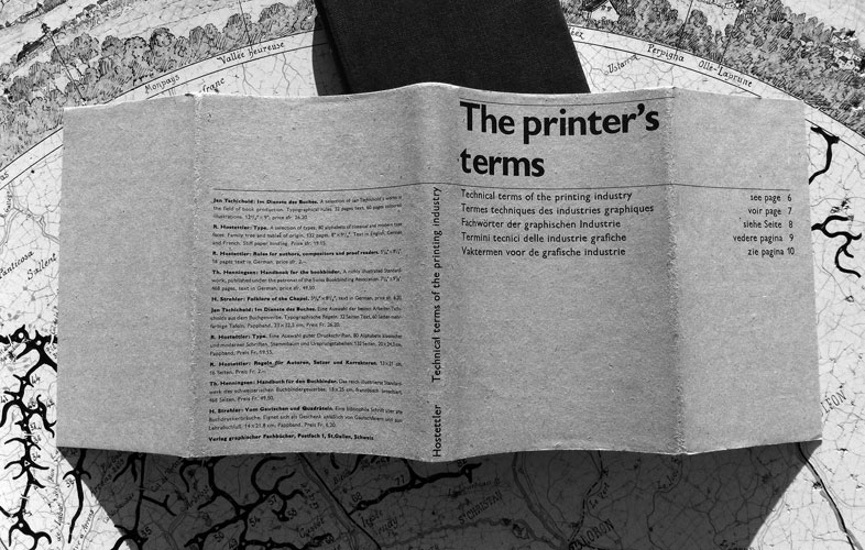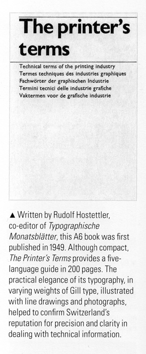 The printer’s terms est le deuxième des trois ouvrages Ă©crits par Rudolf Hostettler Ă©ditĂ©s dans la collection SGM Books—les deux autres Ă©tant Type: A Selection of Types (1949) et Klassierung der Schriften (1964).