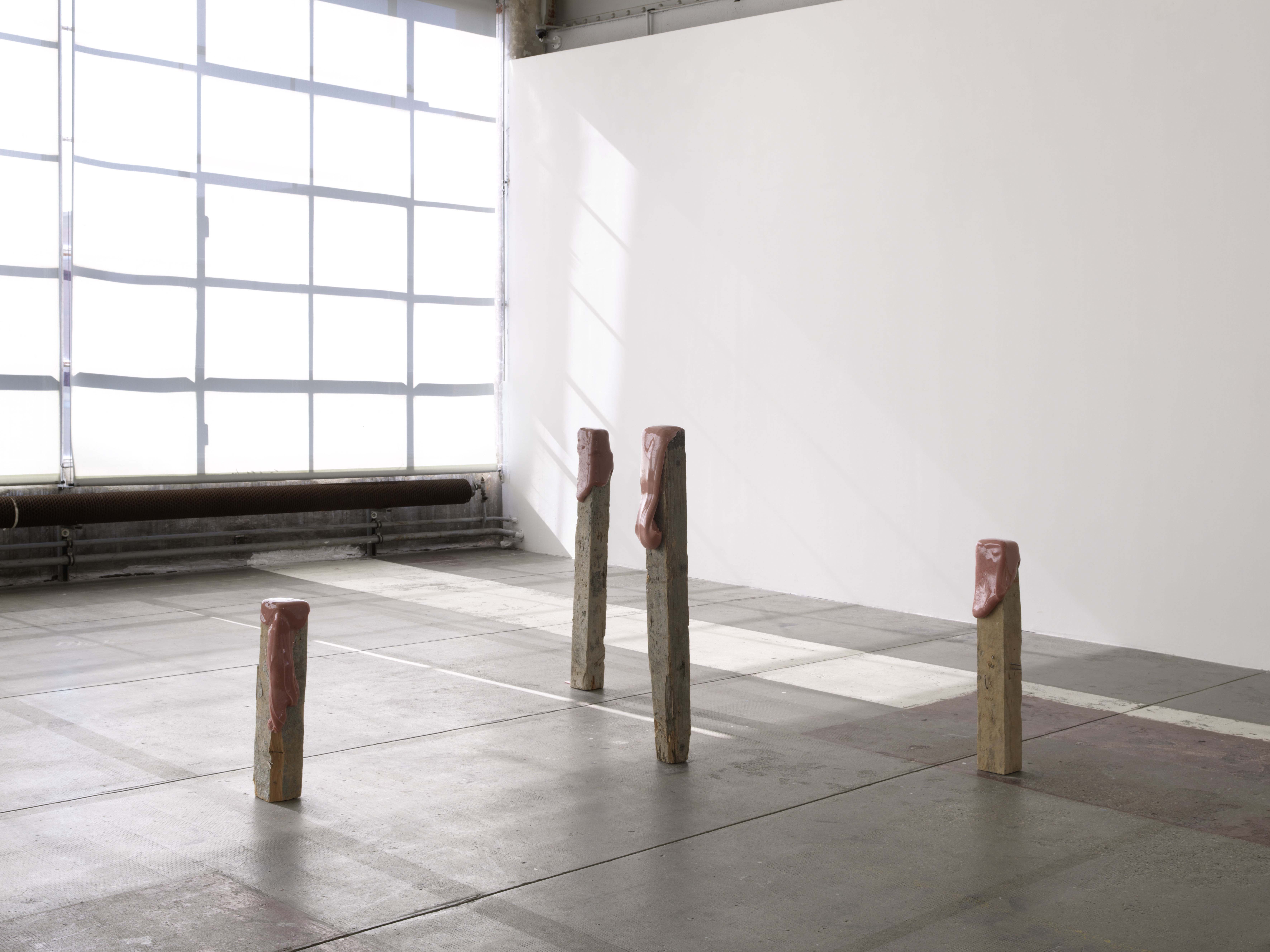 Nina Canell, Treetops, Hillsides and Ditches, 2011. ReÌsine veÌgeÌtale, bĂ»ches ; dimensions variables. Vue de lâexposition The Promise of Moving Things (commissaire : Chris Sharp), Centre dâart contemporain dâIvry â le CreÌdac, 2014. Photo : AndreÌ Morin / le CreÌdac. Courtesy Konrad Fischer Galerie, Berlin ; Collection priveÌe, Belgique. © Nina Canell / Adagp, 2014.