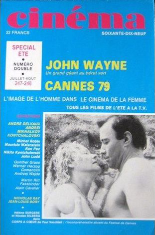 Nous sommes en 1979, au crĂ©puscule des annĂ©es 70, c’est l’Ă©tĂ© et la couverture de CinĂ©ma est consacrĂ©e Ă John Wayne, Ă Cannes et Ă l’image de l’homme dans le cinĂ©ma de la femme. Mais aussi Ă un très bel article de GĂ©rard Courant sur le documentaire de MiĂ©ville et Godard: France, Tour, DĂ©tour, Deux Enfants.