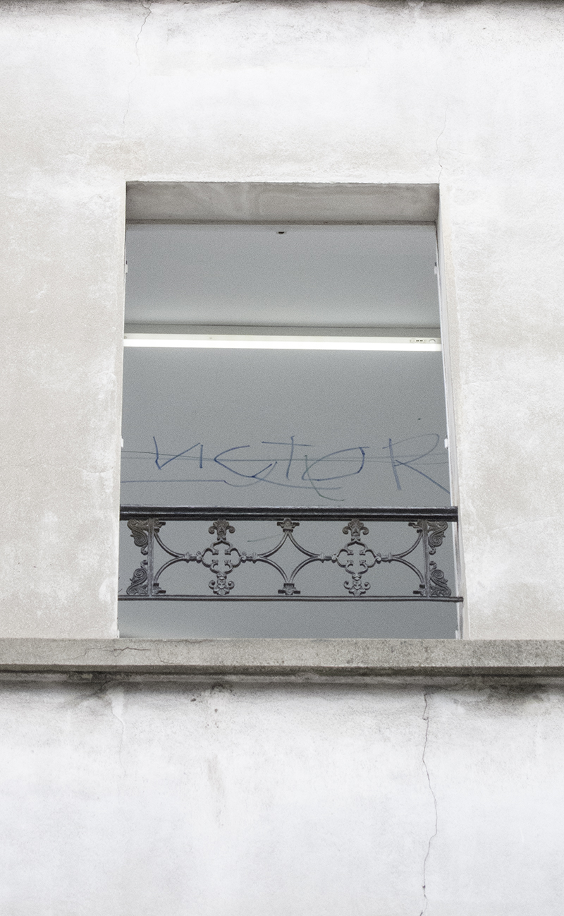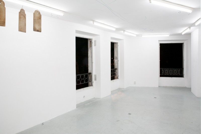 Si vous êtes revenu pour cette seconde invitation, vous vous êtes certainement étonné de retrouver au contraire l’espace quasiment vide, et traversé d’un bout à l’autre par une brise glaciale. Comme on décroche un tableau, Victor Boullet a, pour sa seconde intervention, enlevé les fenêtres de la galerie de leurs cadres laissés vides, ouverts sur la rue en contrebas (la galerie se situe au 2e étage). Comme lors de ses précédentes interventions chez Joseph Tang, Victor Boullet semble vouloir prendre sa revanche sur l’espace en le dégradant matériellement, cette fois-ci, dans sa structure même : au cours des trois semaines d’ouverture de l’exposition, le froid et l’humidité ont commencé à fissurer les murs blancs et le sol en béton gris. Ce faisant, c’est la fonction même du lieu qui est attaquée. Comme, dans une maison traditionnelle japonaise, on donne une fonction à une pièce par l’ajout d’un objet (table, vase, estampe), tout l’art de Victor Boullet consiste à brouiller les codes de l’espace d’exposition par l’ajout d’éléments qui l’atteignent dans son fonctionnement, allant chercher des références esthétiques du côté du chantier, de l’atelier, du stock de magasin chinois, de l’espace en transition. A la différence d’autres artistes jouant de la déconstruction sur un mode précieux, le résultat chez Victor Boullet est souvent sale, grotesque, profondément non photogénique.