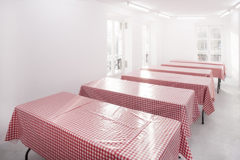 Lors du premier volet de l’exposition de l’artiste norvégien Victor Boullet chez Joseph Tang, vous aviez peut-être cherché à vous faufiler entre de grandes tables de cantine couvertes d’une toile cirée à carreaux rouges et blancs qui encombraient l’espace. Partant à la recherche d’une œuvre, vous vous étiez alors rendu compte que vous-mêmes, peinant pour rejoindre vos amis à l’autre bout de la salle, cherchant ce qu’il pouvait bien y avoir « à regarder », vous faisiez partie de cette exposition. Qu’il n’y avait rien d’autre à voir que ces tables trop grandes et trop nombreuses pour le lieu, fausse invitation à partager un repas de fête, comme une promesse non tenue ; et que cette prise de position, ou de possession, était surtout l’amorce d’un projet plus large qui se révèle surtout lors de son second volet.