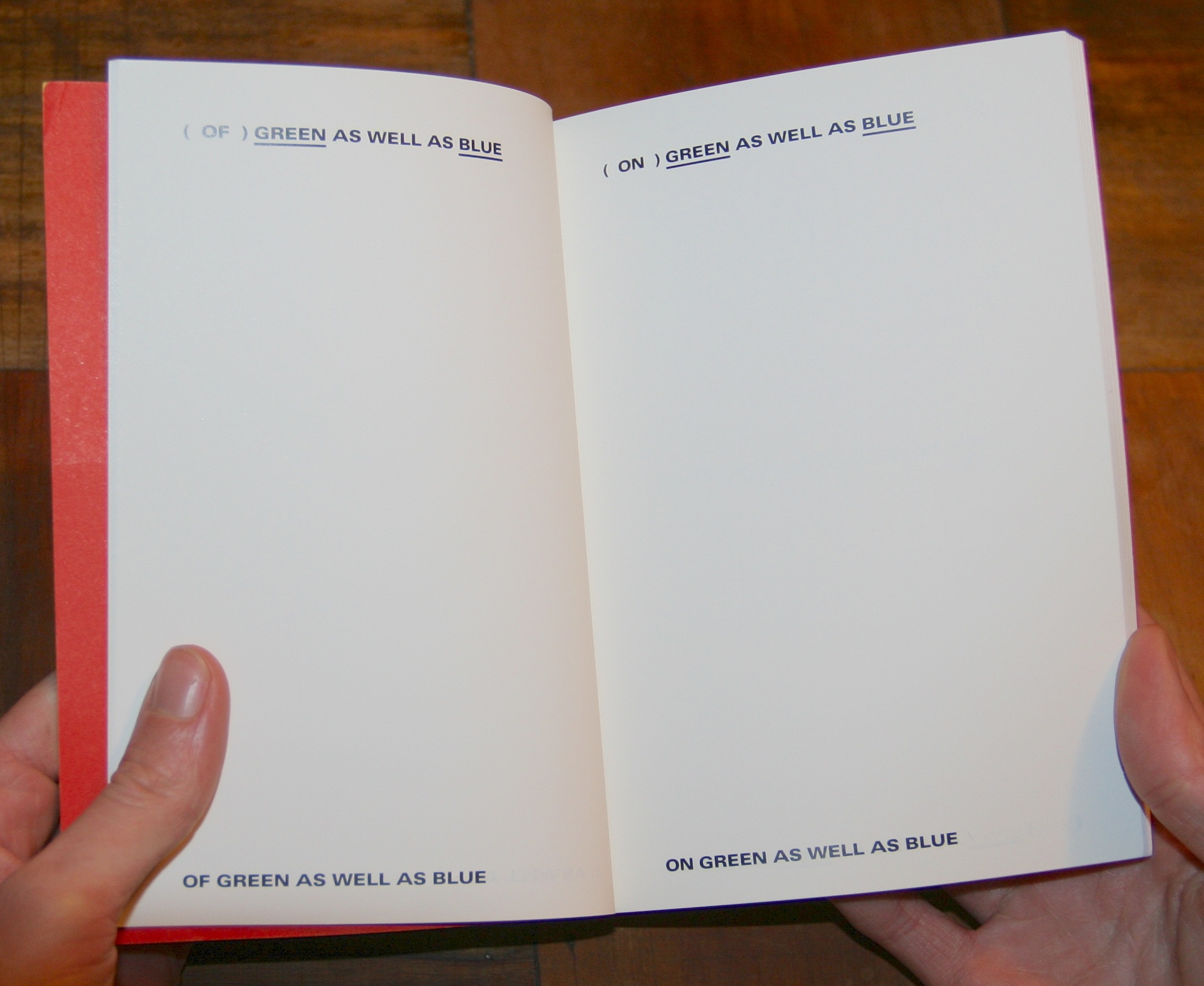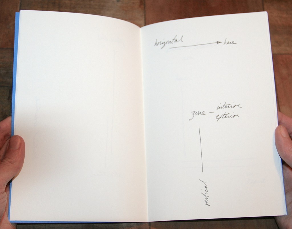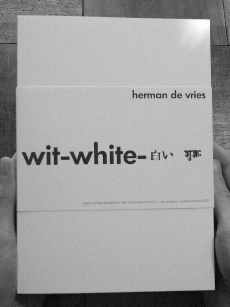 Quatre livre composent à ce jour la collection : Notes on Location (1972) de Peter Downsbrough, série de notes schématiques sur l’expérience de l’espace, que l’on peut lire en particulier en rapport à l’expérience de l’espace du livre, et qui constitue pour ainsi dire la matrice de tout le travail éditorial de l’artiste depuis plus de quatre décennies ; GREEN AS WELL AS BLUE AS WELL AS RED (1972) de Lawrence Weiner, lieu d’inscription d’une série de statements dont la variation se déploie dans la séquence des pages ; South America (1972 encore) de Richard Long, recueil de motifs stylisés tracés par l’artiste au cours d’une marche à travers la Bolivie, le Pérou et le Chili ; wit-white (1980, réédition de la troisième version d’un livre dont la première réalisation date en fait de 1960) d’herman de vries, livre total, universel et parfait à sa manière car intégralement vierge, ses 352 pages restant vides de toutes inscriptions, jusqu’à la couverture elle-même, puisque tout le paratexte (titre, court texte de l’artiste, mentions d’édition) y est rejeté sur un bandeau amovible.