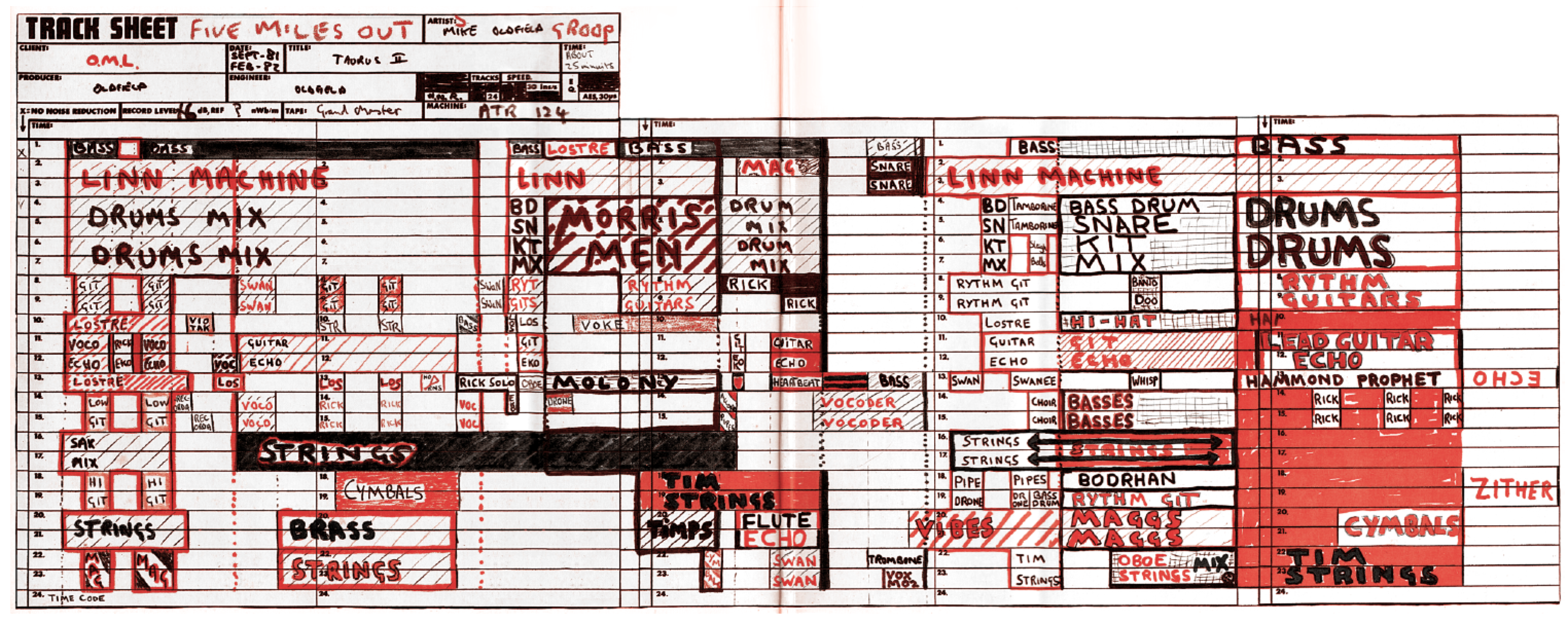 La Track sheet du morceau TaurusII de Mike Oldfield ( 1982 ) exploite au mieux les possibilités graphiques permises par l’usage du feutre pour rendre lisibles et visibles sa structure et ses changements.