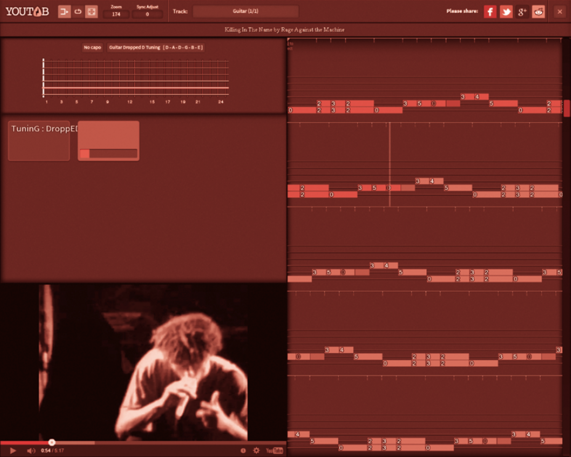 Une page type de Youtab, comprend: en bas à gauche le lecteur Youtube diff usant le clip du morceau ; en haut à gauche, la visualisation de la corde jouée ; en milieu gauche, les options relatives au morceau ( progression temporelle) et l’instrument ( accordage) et à droite, le défilement de la tablature interactive.