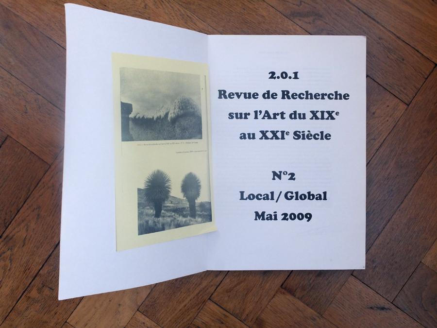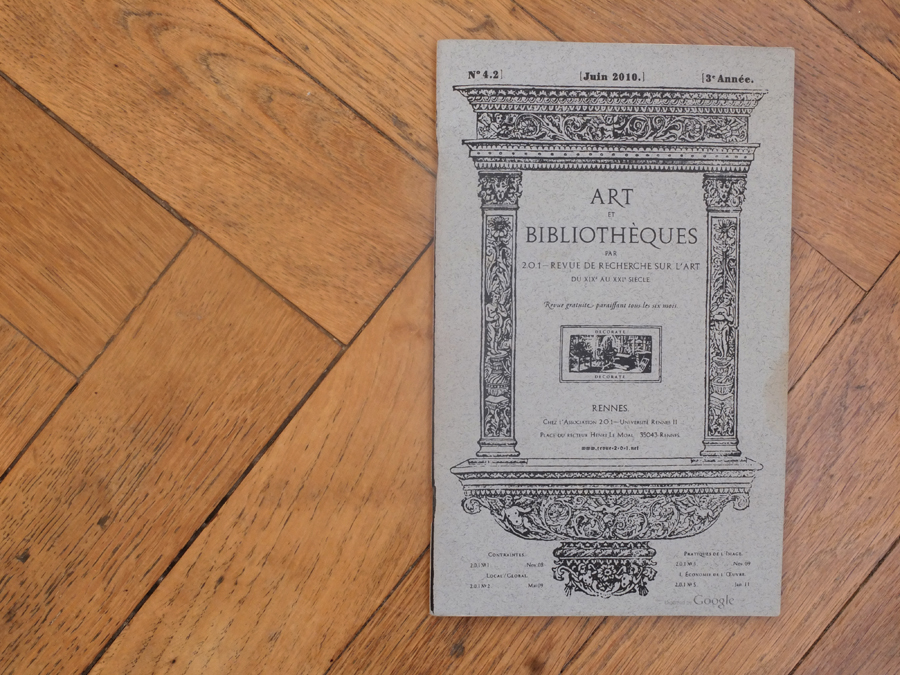 Déplions un peu. Si la revue en ligne <o>future<o> descend de Δ⅄⎈, on peut aussi considérer que la dernière n’est pas sans lien de parenté avec l’aventure de la revue de recherche 2.0.1. Cinq titres ont été publiés de 2008 à 2011 associant des historiens de l’art de l’Université Rennes II, Coline Sunier & Charles Mazé au graphisme et de nombreux artistes invités. Chaque numéro thématique voyait son format et son ordonnancement dicté par la maquette d’un document déjà édité alors remployé : le numéro 2, Local/Global, s’était glissé dans la peau d’un rapport d’activités du Syndicat d’aménagement du val de Drôme de la région Rhône-Alpes, le numéro 4, Arts et biblothèques, reprenait un Bulletin de l’amateur de livres et du libraire de 1860 et le dernier numéro, Économie de l’œuvre, un catalogue de numismatique de Jean Elsen & fils de 2007. Ce réflexe était déjà constitutif d’un goût prononcé pour un travail de graphisme à la fois contraint et discret mais ludique au demeurant.