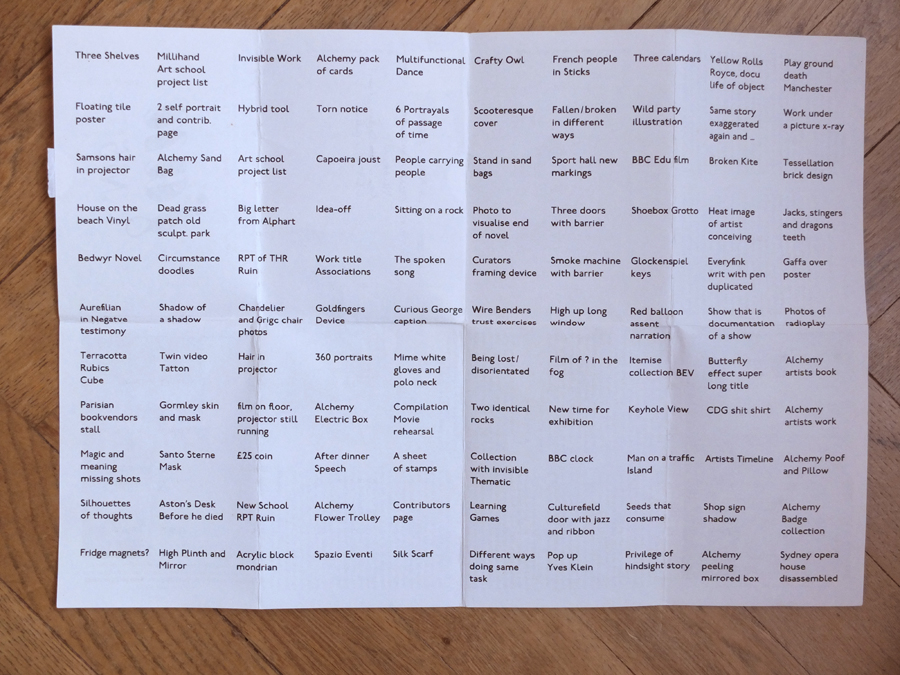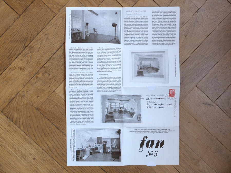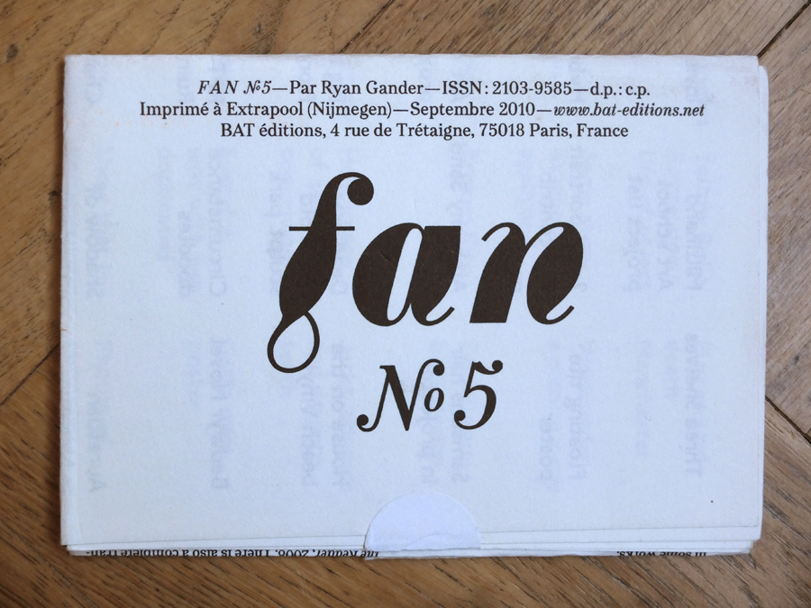 Avec le projet antérieur, Fan, accueillant des contenus composites mais dont le format et le mode diffusion restent communs à tous les numéros7, considérons l’opportunisme comme une programmatique relevant d’une disponibilité plus que d’une facilité – à entendre comme une curiosité doublée d’une grande hospitalité8. Avec un intérêt ample pour les représentations graphiques, ce support a par exemple accueilli une incursion dans le studio de Ryan Gander, rendant compte de la boîte à idées de l’artiste telle qu’elle prend place sur un mur de son studio, avec des projets de titres de pièces toujours écrits et imprimés selon la même norme.