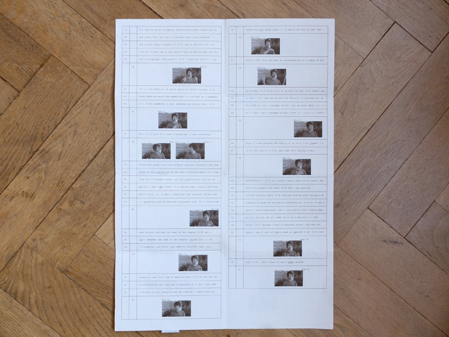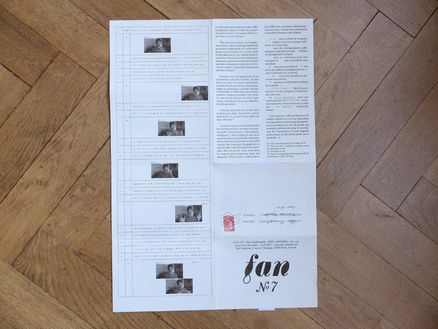 Il a aussi été le support de la transcription d’une vidéo de Mark Horowitz parlant d’une Å“uvre de Sean Fletcher – issue du fonds de vidéos de Joseph del Pesco dans le cadre de son projet Anecdote Archive9 – selon la norme de transcription relevant de l’analyse conversationnelle et de l’ethnométhodologie utilisée par Yaël Kreplak dans le cadre de son travail d’ethnolinguiste10. Cette méthode de transcription déconstruit une prise de parole afin de rendre compte de micro-phénomènes langagiers – verbaux et non verbaux – via un système symbolique11.