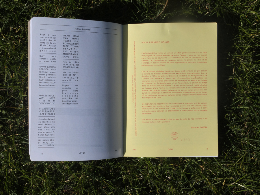 Ces textes, tous de la main des rédacteurs des revues en question, annoncent la fin de la parution de leur périodique. Thomas Owen et Allan Porter formulent respectivement leurs adieux à Fantasmagie en 1979 et à CAMERA en 1981. En novembre 1984, Le Fou parle conclut son édito par « Maintenant, LE FOU se tait. ». Les artistes de General Idea évoquent les limites de leur projet à travers File magazine et annoncent la clôture de cette aventure en 1989. Pour la parution de son dernier numéro en 2003 Martha J. Fleischman éditeur de The American Art Journal, rend compte de la mission de diffusion accomplie par la revue depuis sa création en 1969 et en déroule le générique. L’édito du dernier Nest de 2004 annonce la thématique de son ultime numéro : « future perfect ». Enfin, Pleine marge revient sur la fidélité de vingt-cinq ans à son projet de départ et rend son tablier.