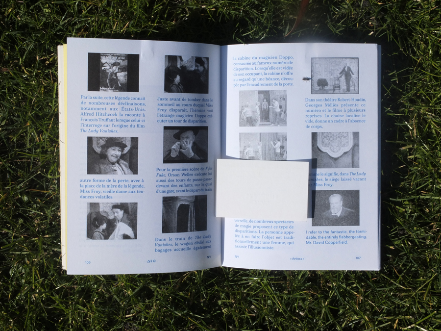 Si elle arrivait dans le deuxième numéro de la revue, c’est Alexis Guillier qui se prêtait à l’exercice avec sa conférence illustrée Artless dans le premier numéro. Celle-ci passe en revue nombre d’exemples de traitement du vide et de l’absence dans des images photographiques, cinématographiques et de dessin-animés. Au principe de l’association libre, ou plutôt lâche, chez Gander on peut alors opposer un corpus plus réduit, un examen plus fouillé de chaque source et une citation précise de chaque référence dans l’appareil de notes. Ce qui est indéniablement commun, c’est la mise en forme du rendu de la conférence. Cette mise en forme allie simplicité et adéquation au format conférence, si bien qu’on a tendance à l’oublier. Elle fait école.