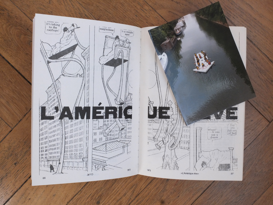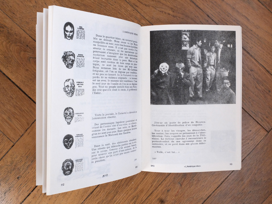 Dans le troisième numéro de la revue13 le reprint d’un chapitre des Commentaires de Chris Marker – L’Amérique rêve, pitch d’un film imaginaire – permet de forcer une filiation entre ses retranscriptions de conférences et les notes du réalisateur, en images et textes : les images sont tantôt intercalées aux paragraphes – comme des paragraphes elles-même à moins que ce ne soit les textes qui sont comme des images – tantôt en notes, en marge.