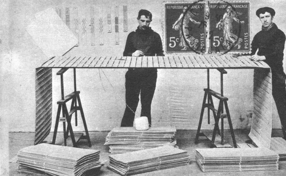SystÚme de tissage mécanique Jacquard : laçage des cartons avant perforation.