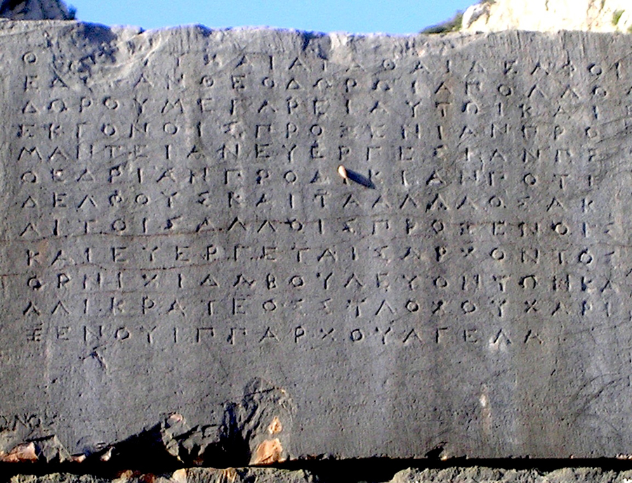 Alors que vers 1750 avant notre Ăšre, la stĂšle dâHammurabi confortait le « roi de droit » babylonien, dans cette GrĂšce plurielle du VIIe siĂšcle avant J. C., les pierres levĂ©es gravĂ©es, les tables dâĂ©criture de marbre ou de bronze, garantissent, en diffusant au plus grand nombre â limitĂ© aux membres admis de la citĂ© â les lois discutĂ©es et dĂ©finies par des reprĂ©sentants Ă©lus de la communautĂ©, les conditions de lâĂ©galitĂ© face Ă la loi Ă©crite. Le scribe autrefois cloĂźtrĂ© dans la caste du palais royal, se fait Ă©crivain public, « lĂ©gi-graphe »8 de lâagora. Chaque citoyen alphabĂ©tisĂ© peut devenir, Ă tour de rĂŽle, le secrĂ©taire des lois de tous et de chacun.