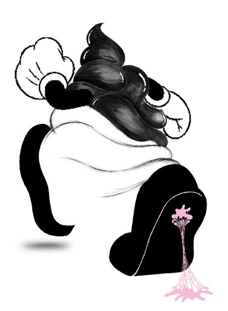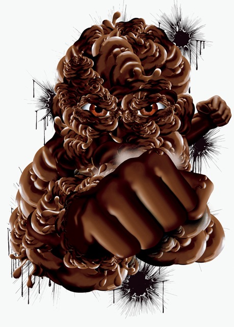 Les crĂ©ations de MS nous enclavent dans cette numĂ©risation illusionniste Ă outrance. En cela, il se rattache et met en exergue la logique de nos hypermarchĂ©s de lâimage ultralĂ©chĂ©e. Le registre du liquide, du lĂ©chĂ© et de la giclure, est particuliĂšrement rĂ©current dans la palette graphique du graphiste. Lâimage nous dĂ©saltĂšre, lâimage nous enivre. Lâimage est alimentation, omniprĂ©sente, dĂ©goulinante, aussi salvatrice quâĂ©cĆurante. La revue Toilet Paper31 a particuliĂšrement radicalisĂ© cette idĂ©e de nourriture et dâexcrĂ©tion visuelle.