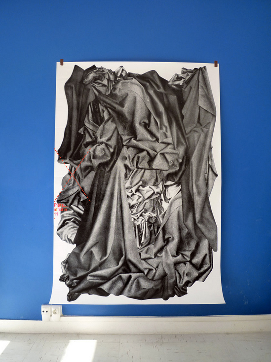 Lâaffiche recto-verso Pieta (2011) est une composition syncrĂ©tique14, accumulation arrangĂ©e de drapĂ©s issus de tableaux conservĂ©s au Prado (fragments de tableaux scannĂ©s dâaprĂšs des catalogues). Lâaura des Ćuvres dâart se poursuit dans la rĂ©appropriation du temps Ă saisir le pli. Pieta est lâimage dâune empreinte, un suaire reproductible, un linceul Ă double face de corps dâhumains repliĂ©s, de pleureurs disparus⊠Souvent dans ses accrochages, MS laisse ses affiches pendre sur un bout de bois, flottant au vent. Le pli du papier se rĂ©pand. Lâaffiche devient drapĂ©, presque un bas-relief.