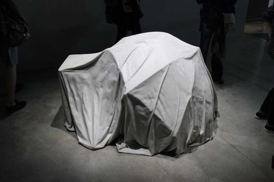 Ryan Gander, dans une sĂ©rie rĂ©cente de sculptures en rĂ©sine de marbre9 , anoblit des cabanes, Ă lâinstar de celles que sâinventent constamment les enfants avec des chaises, des bouts de bois, avec tout ce quâils trouvent Ă proximitĂ© dâeux et quâils recouvrent dâun drap10 . Les enfants sâenveloppent dans ce voile de sĂ©curitĂ© qui les met Ă lâabri du regard des adultes, qui les blottit dans leur imaginaire. Mais les cabanes de Gander Ă©voquent Ă©galement les protections dâinfortune des sans-abris. TransposĂ©es dans un musĂ©e, elles certifient la supercherie, elles sont piĂ©gĂ©es par le marbre. Aucune ouverture. Le drapĂ© fait bloc. Les cabanes sont impĂ©nĂ©trables. Comme les images drapĂ©es de MS, comme ses paysages impossibles Ă habiter. Les espaces piĂ©gĂ©s de MS nous placent toujours face Ă un mur.