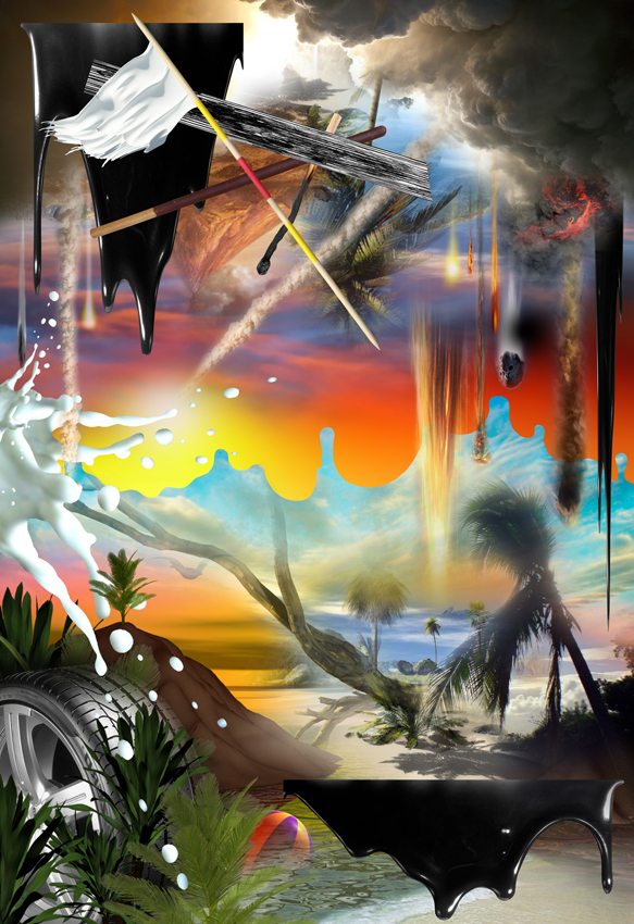 Le paradigme numĂ©rique façonne cette affiche. Le graphiste coince notre regard devant un mur-Ă©cran hyper illusionniste. MS organise un tumulte, vĂ©ritable big-bang matriciel entre diffĂ©rents mondes, toujours des fragments dâimages marquĂ©es par une prĂ©cision ultra, tout nâĂ©tant que des fragments Ă caractĂšres et Ă sujets mineurs. Aujourdâhui, nous sommes de moins en moins confrontĂ©s Ă des peintures Ă touche et de plus en plus Ă des images numĂ©riques semblant « dĂ©matĂ©rialisĂ©es ». Internet, le monde publicitaire nous permettent dâatteindre les terres de lâIllusion, du moins un leurre sublimĂ© et bluffant. Dans Oracular Vernacular, les pneus sont gonflĂ©s et crantĂ©s, les enjolivers chromĂ©s, le lait goĂ»teux, les palmiers ver(t)nissĂ©sâŠ