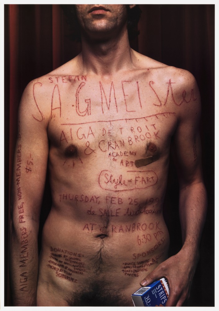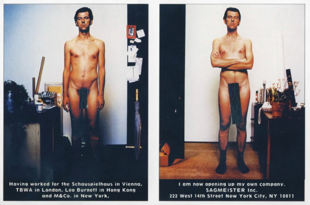 Sagmeister affirme qu’une idée simple tenue par une implication personnelle et un peu de « couilles » est plus opérationnelle qu’une armada numérique. La représentation phallique est essentielle à l’œuvre de Sagmeister. S’offusquant de la neutralité du discours et du corps typographique, le graphiste refuse toute neutralité du corps (graphique). Ses nus se situent entre deux écueils, celui de la représentation narcissique (héroïque et masculine) et celui de la construction idéologique des corps. En effet, avec ses apparitions dénudées, il évoque subrepticement les déterminations liées au sexe (et à la sexualité) au sein du design graphique et il joue de l’ego-système des fantasmes.