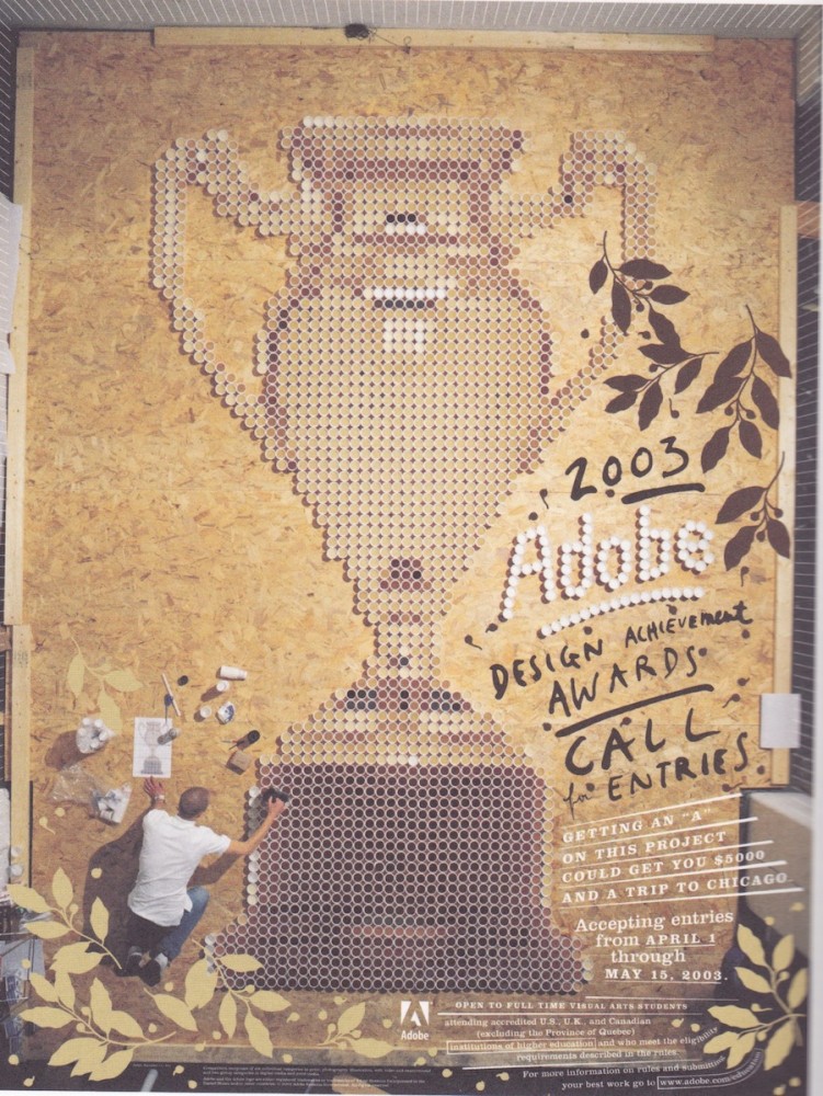 En 2003, Adobe réplique et commande une affiche à Sagmeister pour un concours étudiants11. Pour ce second geste facétieux, Sagmeister impose une installation conséquente avec un minuscule élément de base : le gobelet en plastique qui abreuve les distributeurs de cafés12 de notre village planétaire (et à l’avantage du pixel 0-1, celui-ci peut-être café au lait, ainsi que suggérer la profondeur du langage bitmap). Ce gobelet symbolise la standardisation et l’homogénéisation des outils graphiques. Cette logique de normalisation, Sagmeister et son équipe vont patiemment et malicieusement la contourner. Deux mille cinq cents gobelets seront disposés. Tout a été planifié méthodologiquement13. L’affiche révèle son processus d’élaboration (l’assistant n’a pas fini d’installer le trophée). En figeant un acte en construction, le visuel final étire le temps et concrétise la nécessité temporelle de penser une image. Prendre le temps convoque une logique anticonsumériste. Sagmeister revient à des signes passablement ringards: une couronne de laurier, une coupe (inachevée) de type compétition sportive. L’ensemble parjure l’idée d’une soumission à l’étalage technologique et au brio de l’innovation.