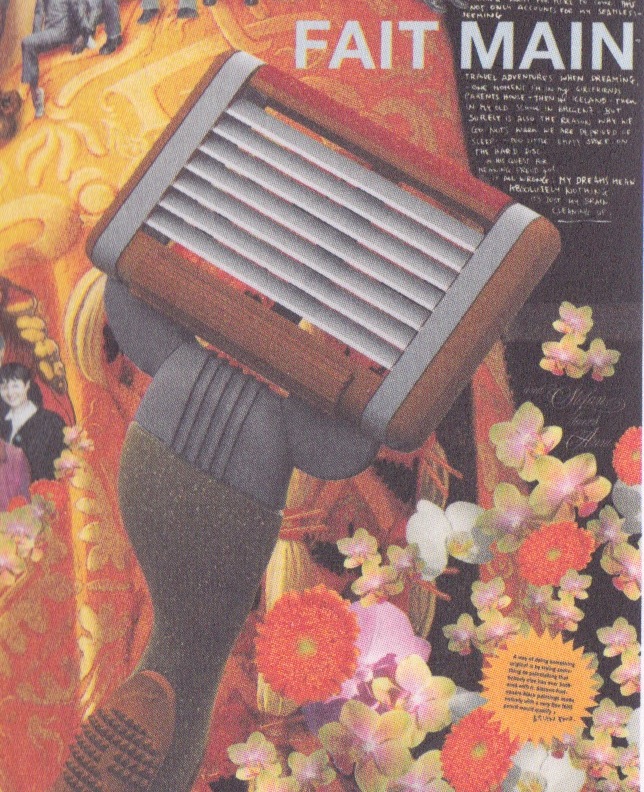 Le fait-main15 plus qu’un courant est une parade, qui symptomatiquement, rassure un créatif sur la possibilité de signer, sur la possibilité d’être encore un auteur à l’heure où non seulement les machines sont capables de splendeurs (il suffit de regarder l’imagerie scientifique en micro et en macro), mais où elles l’entraînent dans une cadence de productivité qu’il ne pourra pas suivre. Cela peut paraître désopilant de constater la résurgence, dans et depuis les années 199016, des activités manuelles et des arts d’agréments17 dans une société qui pourrait s’en passer. On pourrait vivre de prêt-à -manger, de prêt-à -porter, de concentrés, de prêts-à -découper, d’affiches ou de papiers peints prêts-à -poser (et le tout biodégradable). Peut-être l’être humain est-il un animal social et politique si peu doué pour rester seul, monologuant avec la violence de ses idées. Seul prêt-à -tout, dans ce face-à -face avec son, ce, les pouvoir(s). Peut-être que l’inaction physique que provoque l’ordinateur le déstabilise profondément.