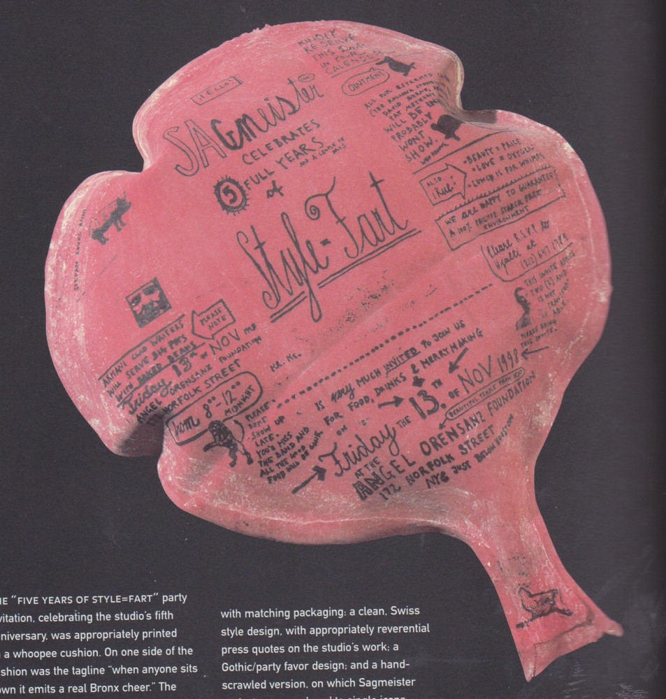 - Invitation pour les cinq de son studio, « five years of style = fart », New-York, 1998. [↩]