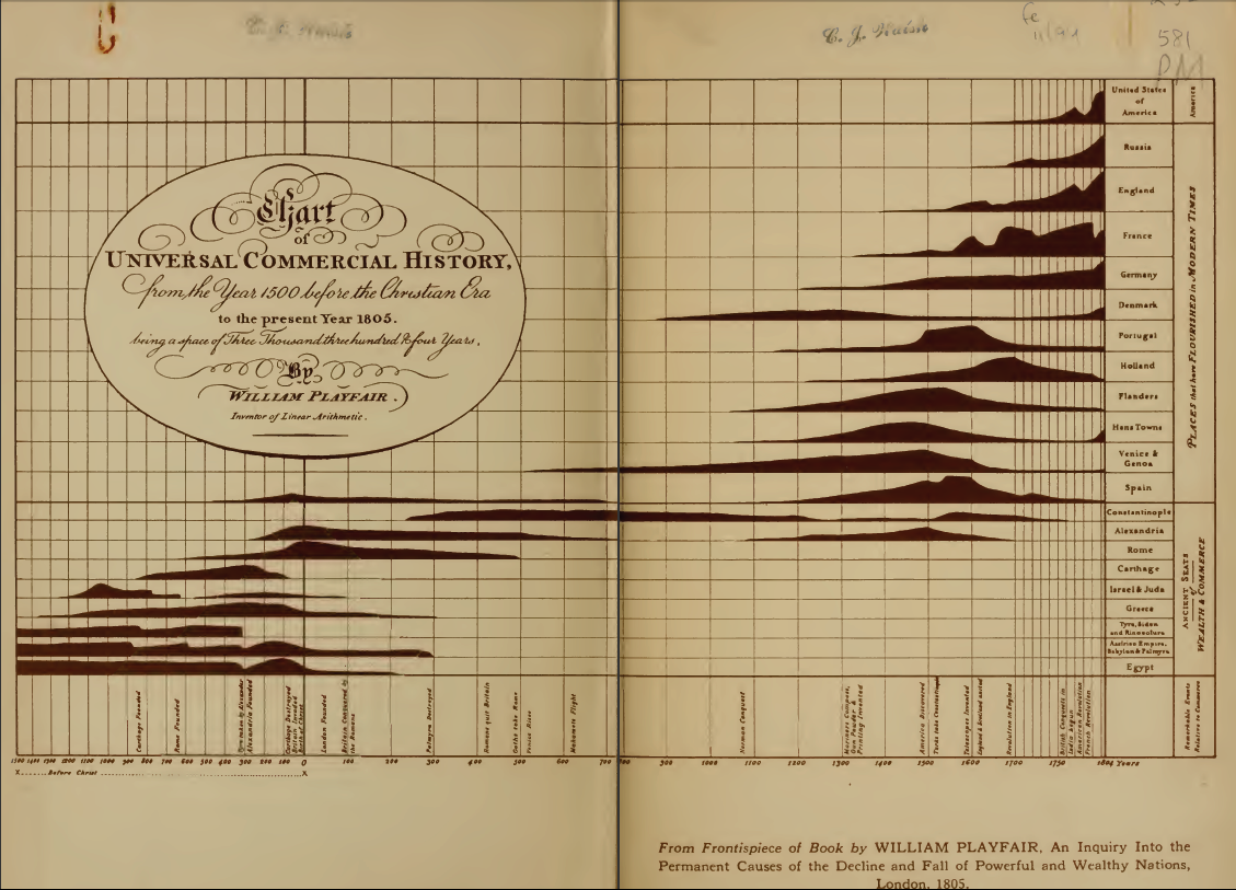 • La fin du XVIIIe siècle s’avéra être le moment où les graphiques et diagrammes ont révélé leur utilité à l’Europe. Au nord de celle-ci, en Écosse, se trouve la ville de Dundee où William Playfair vit le jour en 1759. Notons que Dundee sera baptisée, quelques années plus tard, City of jute, jam and journalism pour son essor industriel dans le jute, la marmelade et le développement du journalisme. Journalistes et historiens, amateurs de confiture d’agrumes ou non, attribuent à William Playfair (1759-1823) les premiers exemples de représentations graphiques de données sous forme de séries chronologiques et d’histogrammes en 1786 (Commercial and Political Atlas) et de diagrammes circulaires en 1801 (Statistical Breviary).