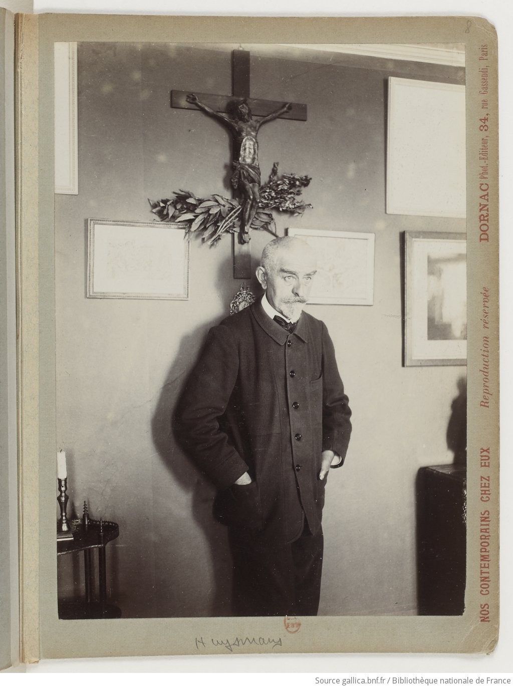 Parmi eux, une photographie où J.-K. H., en 1903, après son retour à Paris (suite à la fermeture de Ligugé où il pensait avoir trouvé un havre) pose devant un mur, sous un crucifix † Le cliché fut pris par Dornac à Paris (je suppose) en 1903 et publié dans Nos contemporains chez eux, ouvrage signé de ce même photographe.