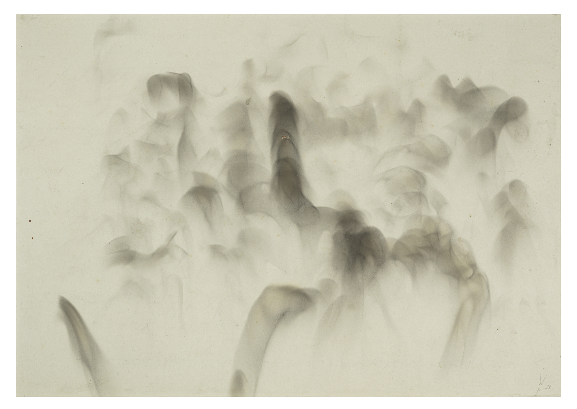 *en consultant la boutique en ligne ichetkar, mi-août 2023, la donne a changé : l’exemplaire du livre affiché à l’écran ne dispose plus ses matériaux de façon semblable à celui qui est lu21 . La constitution du livre varie. La surimpression noire du buste de J.-K. H. sur le panneau d’O. R. semble insister davantage sur le montage – ou une condensation (comme dans un rêve) – que sur l’identification J.-K. H.-lecteurice-Bougran. La surimpression ne joue plus autant du dispositif tournant des pages. Mais ce nouveau montage fantasme le buste, l’allège encore d’un degré – tout en nous retirant ce que l’impression sur le seul recto d’un feuillet tendait à exprimer : le croisement de dispositions matérielles et d’une autre fiction au sein du livre. L’imaginaire ne joue plus de la même manière dans et avec le livre. L’image spectrale du buste par la réduction de la ronde-bosse à une fragile couche d’impression – comme un fumage surréaliste (cf. Wolfgang Paalen, inventeur du fumage, vers 1936-37)22 – déplace l’accent sur la facture graphique. La qualité fantasmatique de la scène provient de la superposition des images et de la répétition du panneau (surimprimé puis non) des pages 25 à 28 (ce qu’aura confirmé la prise en main de cet autre exemplaire).