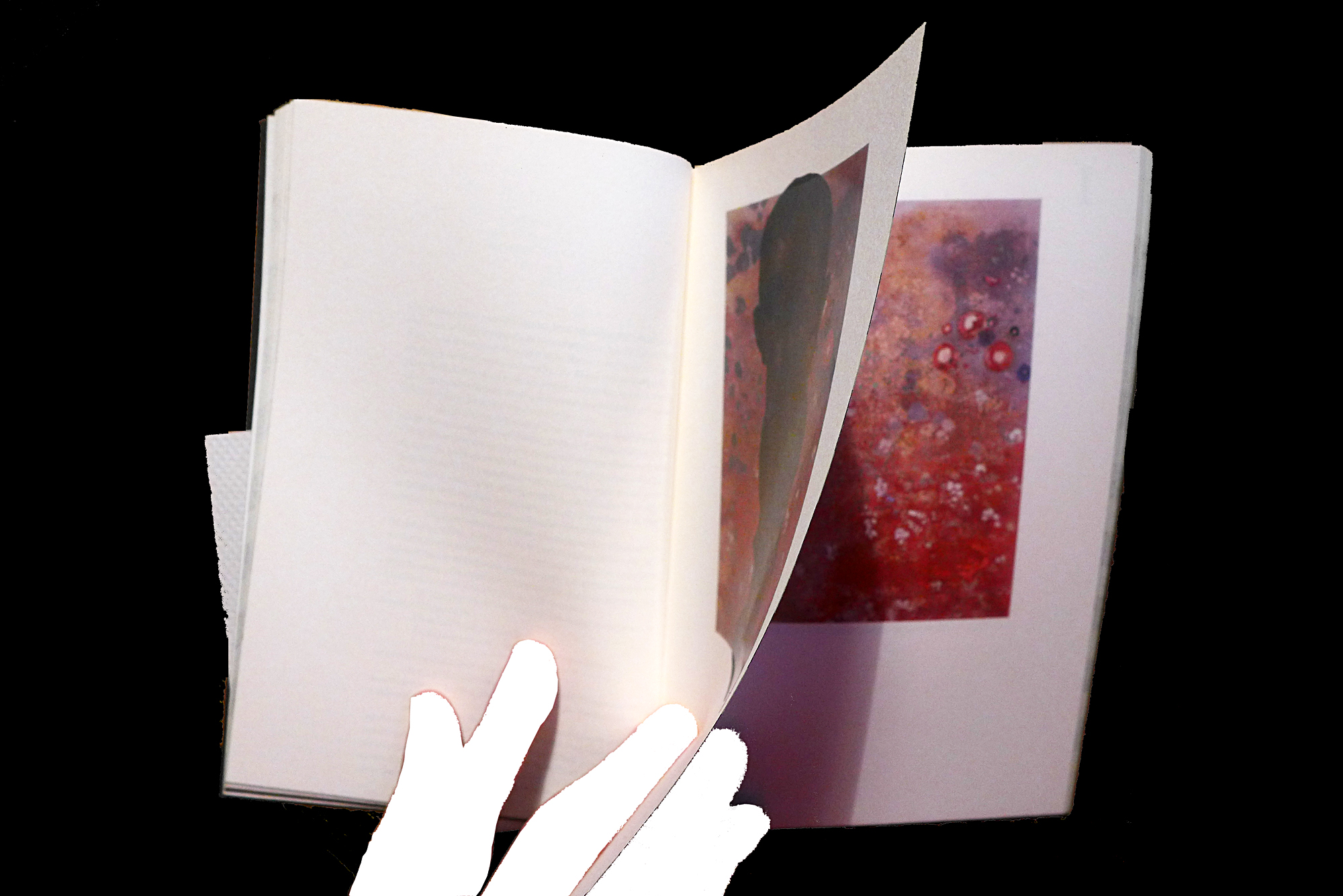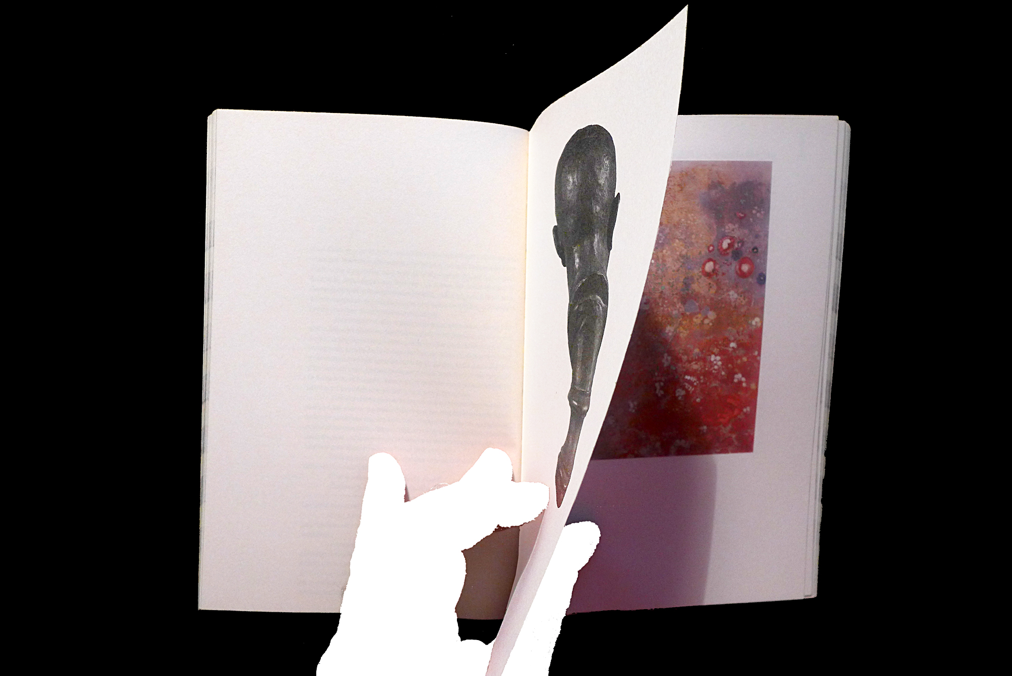 Des motifs6, fabriqués de matériaux tant typographiques qu’iconographiques choisis par Sp Millot, ainsi que leur arrangement dans le codex, sont inscrits avec le texte, et travaillent (à) ce livre. Il s’agira d’une graphie – du livre – avec un texte par avant rédigé, par ailleurs publié : comme deux récits croisés, une crucifiction. Le livre est un passage plus qu’un registre où le texte est consigné.
