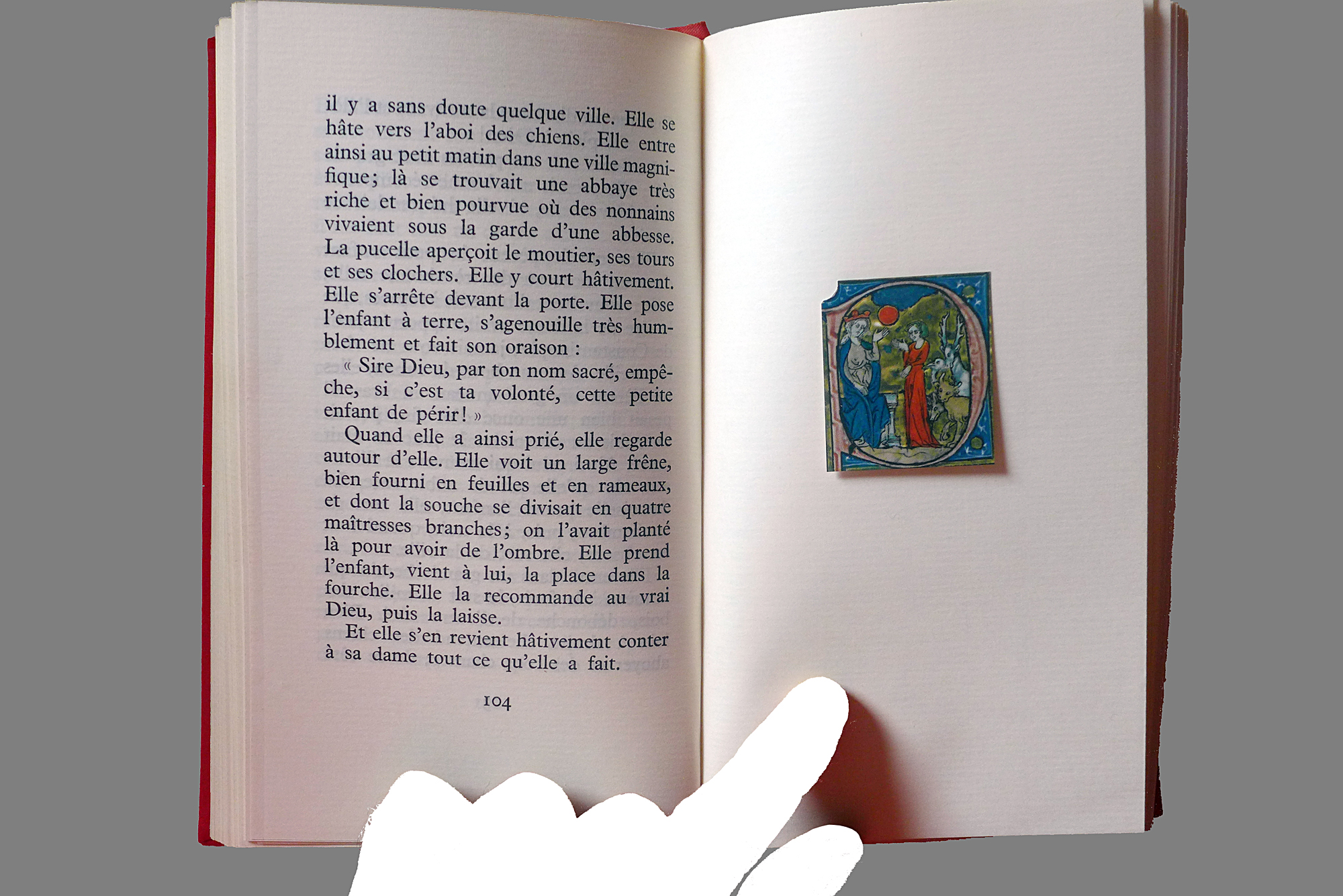 vignette collée (exemple extrait de : Pierre Faucheux, «Les Lais de Marie de France», 1961, réalisation par Les Libraires Associés), version en couleur